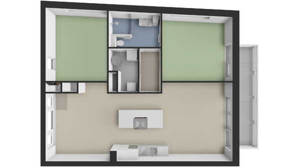 Bij binnenkomst van het appartement stapt u direct in de eetkamer, die in open verbinding staat met de centraal gelegen keuken en de woonkamer. De gehele woning is afgewerkt met een moderne pvc-vloer met comfortabele vloerverwarming en strak gestucte wanden en plafonds.