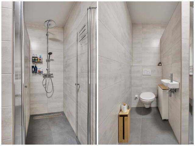 De badkamer is modern en volledig betegeld in een stijlvolle beige-grijze kleurstelling. Voorzien van een ruime inloopdouche met glazen deuren, een wastafelmeubel met spiegel voorzien van verlichting en verwarming, een hangend toilet en een elektrische radiator.