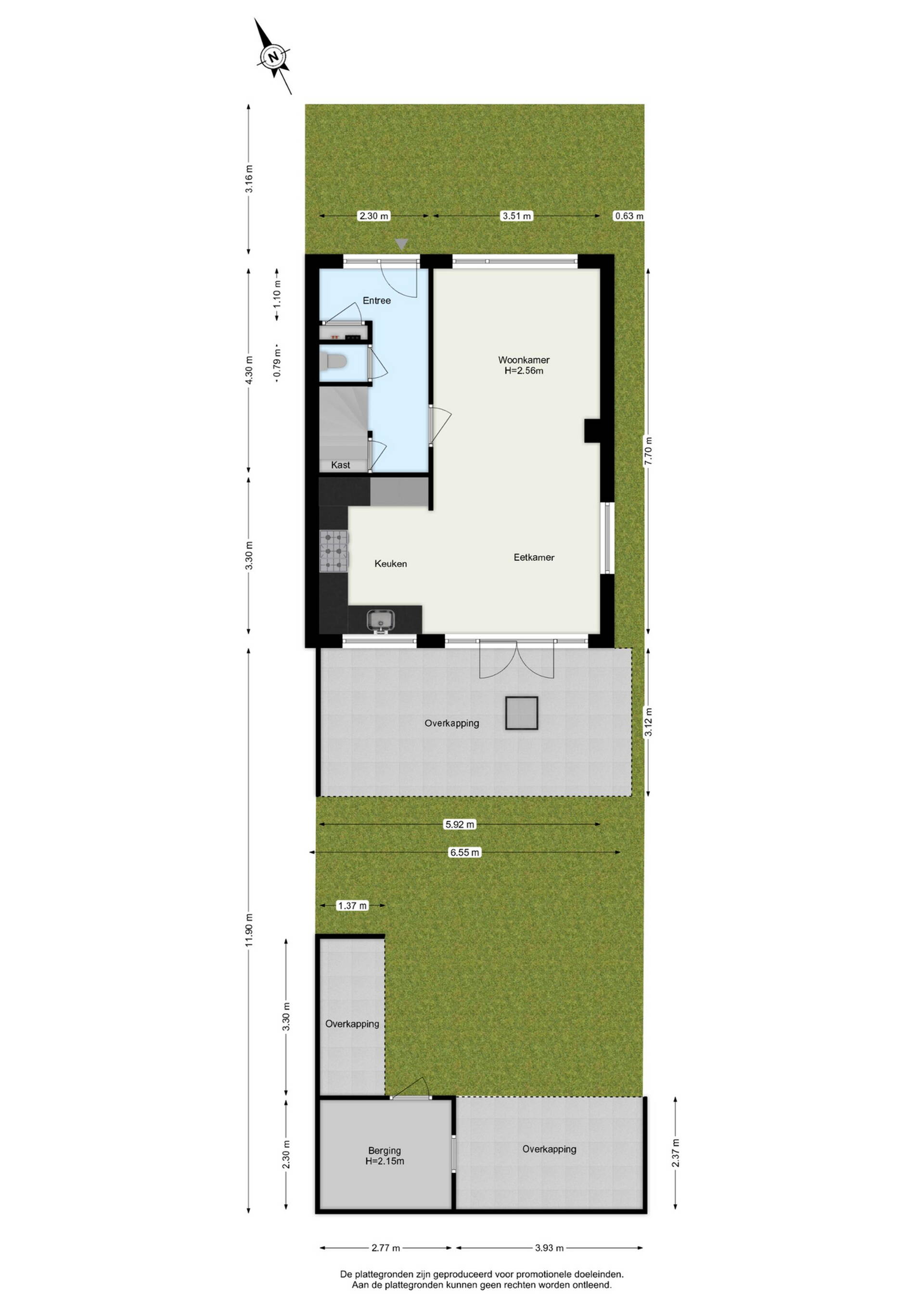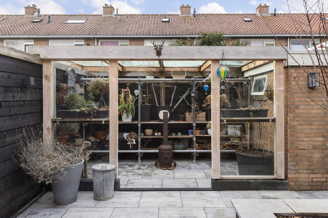Achterin de tuin zijn meerdere praktische voorzieningen aanwezig. Zo is er een overkapping voor het stallen van fietsen of een scooter, een aparte overkapping voor het neerzetten van spullen en daarnaast een stenen berging voor extra opslagruimte. De tuin is rondom afgewerkt met een antracietkleurige schutting, voorzien van sfeerverlichting. Via een deur in de schutting is er een directe uitgang naar de straatzijde, wat extra gemak biedt.