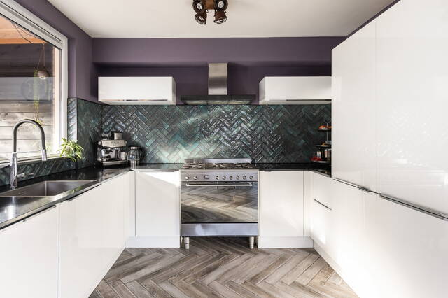 De open keuken sluit naadloos aan op de woonkamer en is modern uitgevoerd. De keuken beschikt over witte kasten, een zwart aanrechtblad en een achterwand met een visgraatmotief, wat het geheel een stijlvolle uitstraling geeft. De keuken is voorzien van diverse apparatuur, waaronder een vaatwasser, koelkast, vriezer en afzuigkap. Daarnaast is er een vrijstaand 5-pits gasfornuis met oven aanwezig. Er is voldoende opbergruimte voor keukengerei en voorraad. Een groot raam in de keuken biedt prettig uitzicht over de tuin en zorgt ook hier voor veel natuurlijk licht.