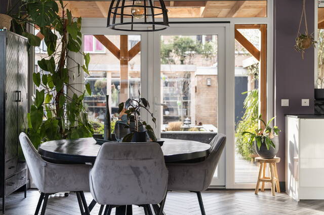 De woonkamer is heerlijk licht dankzij de grote raampartijen en het extra zijraam, wat kenmerkend is voor deze hoekwoning. Het daglicht zorgt voor een open en prettige sfeer en er is volop ruimte voor een comfortabele zithoek en een royale eethoek.