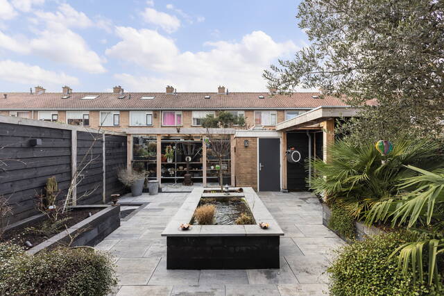 In de tuin zijn diverse verhoogde, ingebouwde plantenbakken aangebracht, die zorgen voor groen en sfeer. Centraal in de tuin bevindt zich een kleine vijver met vissen, wat een rustgevend en bijzonder element toevoegt aan het geheel.