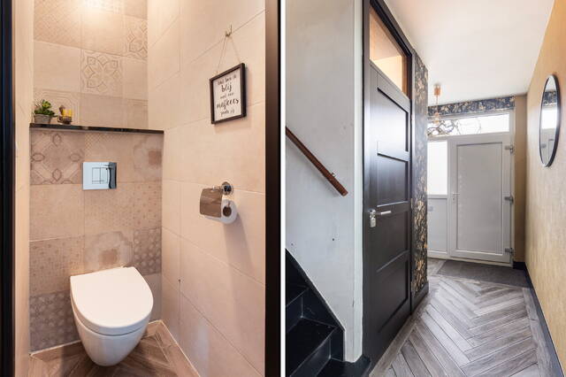 De gehele begane grond is afgewerkt met een prachtige visgraatvloer van tegels en is voorzien van vloerverwarming, wat zorgt voor een comfortabele en gelijkmatige warmteverdeling. Alle wanden en plafonds zijn strak gestuct en afgewerkt, waardoor de woning direct netjes en verzorgd aanvoelt.