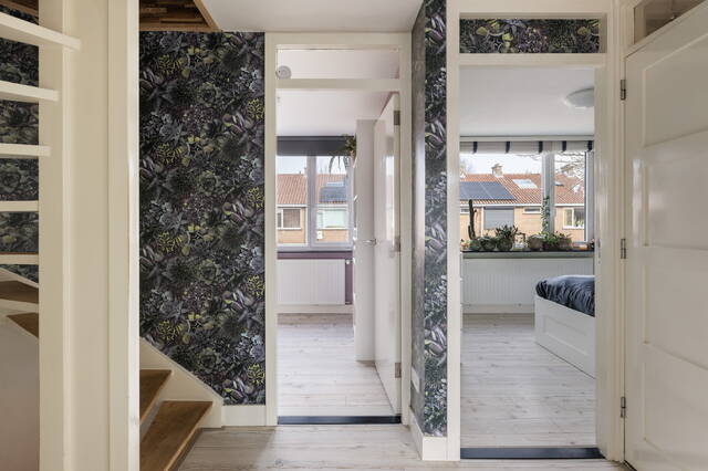 De trap naar de eerste verdieping is bereikbaar vanuit de hal en vormt een praktische en overzichtelijke verbinding met de slaapverdiepingen.