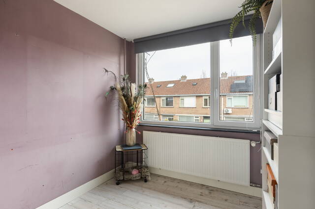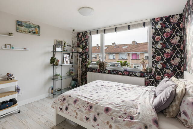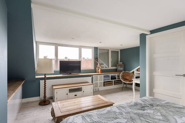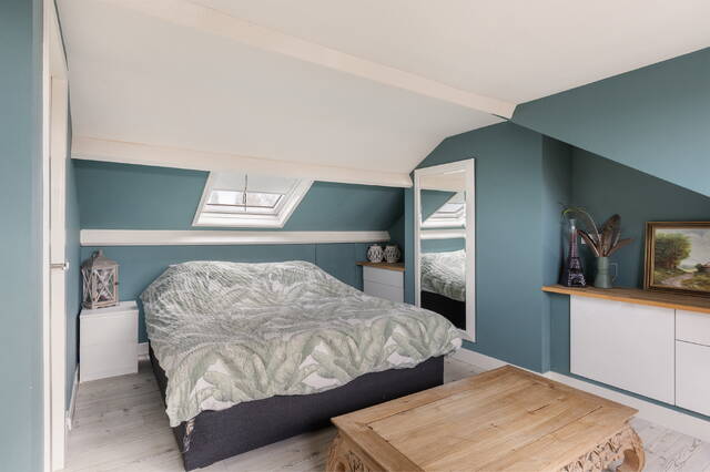 De slaapkamer op deze verdieping is opvallend ruim dankzij de dakkapel die over de volledige breedte van de woning is geplaatst. Hierdoor is er niet alleen veel extra ruimte ontstaan, maar ook een prettige hoeveelheid daglicht. Aan de voorzijde is daarnaast een Velux dakraam aanwezig, wat zorgt voor extra lichtinval en ventilatiemogelijkheden.
