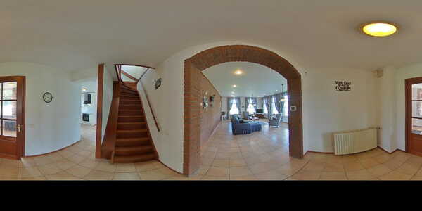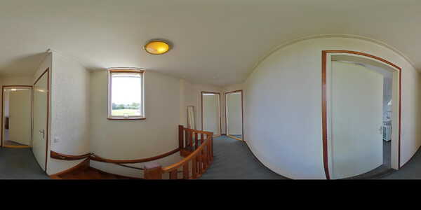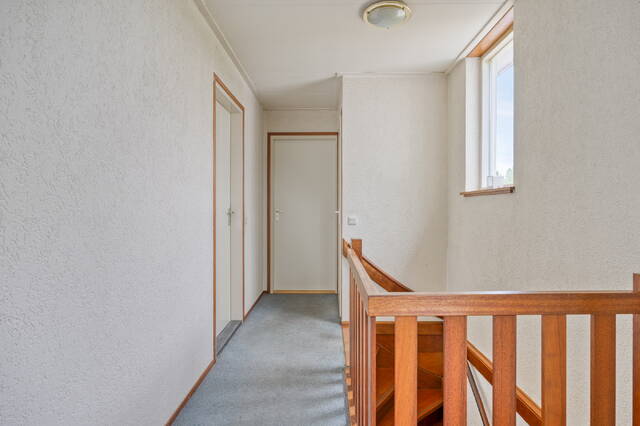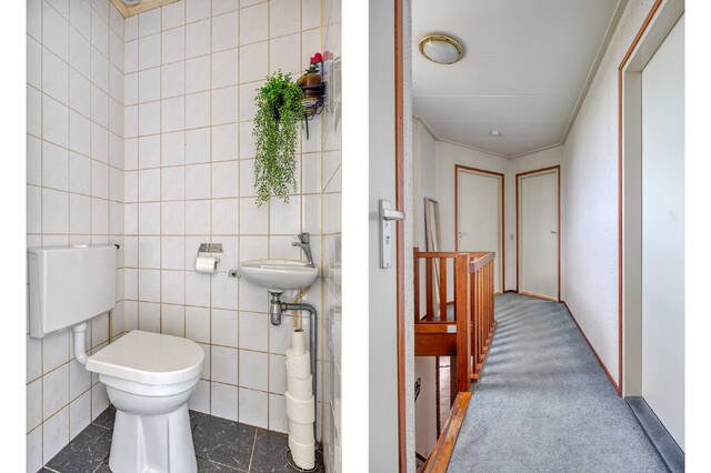 Ruime overloop met toegang tot alle vertrekken. Toiletruimte voorzien van een duoblok en fonteintje. De toiletruimte is geheel betegeld in een witte en grijze tegelvloer.