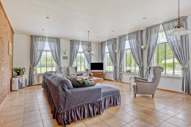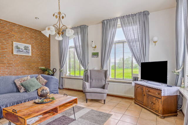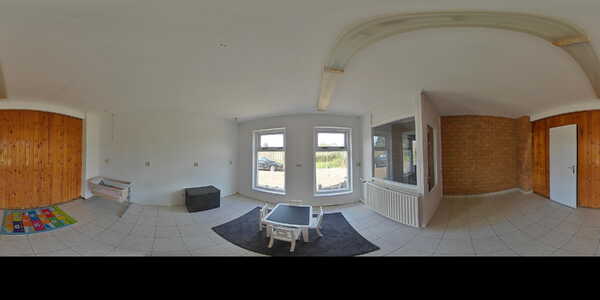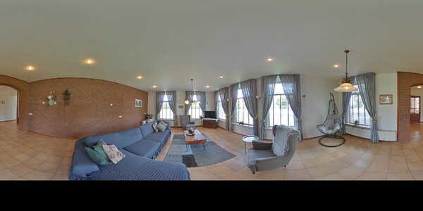 Royale en lichte woonkamer (ca. 39 m2) voorzien van tegelvloer met vloerverwarming en spotjes. Door de grote raampartijen biedt deze kamer een aangename natuurlijke lichtinval en vrij uitzicht over de dijk.