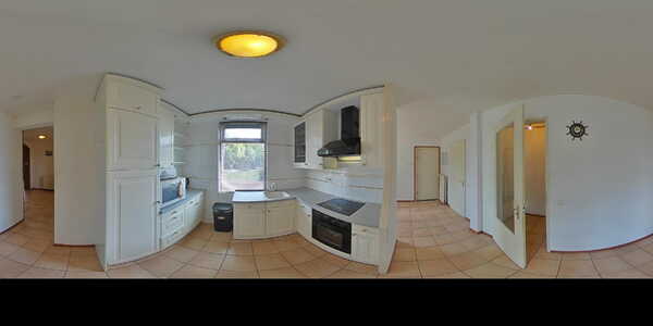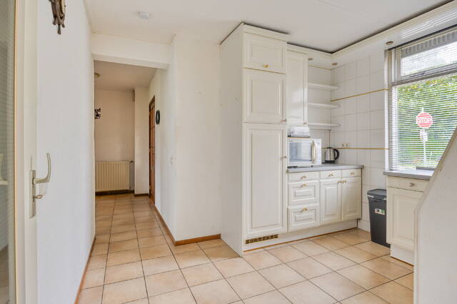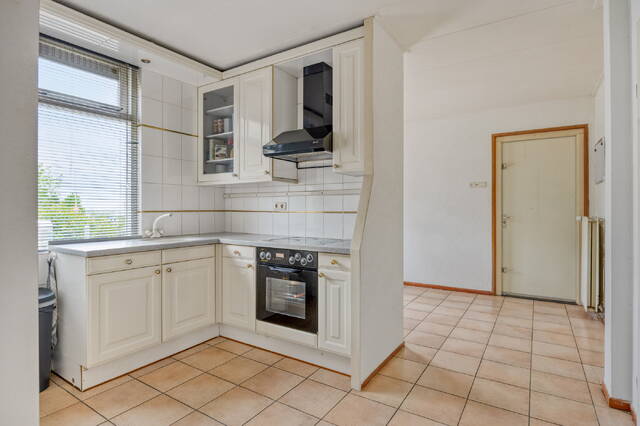 De open keuken (ca. 20 m2) is uitgevoerd in een L-opstelling met een extra kastruimte. De keuken is voorzien van een enkele spoelbak, koelkast met vriesvakje, keramische kookplaat, afzuigkap en oven. Het geheel is uitgevoerd in lichte kleuren en afgewerkt met een kunststof aanrechtblad en tegelvloer met vloerverwarming. Via de keuken heeft u toegang tot de bijkeuken, de eetkamer en de deur naar het souterrain.