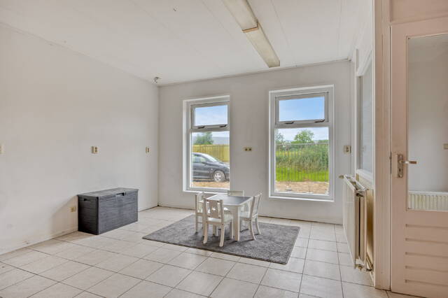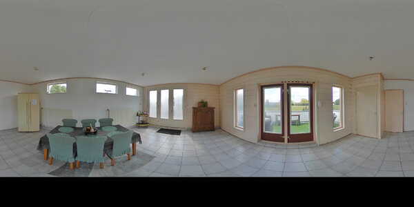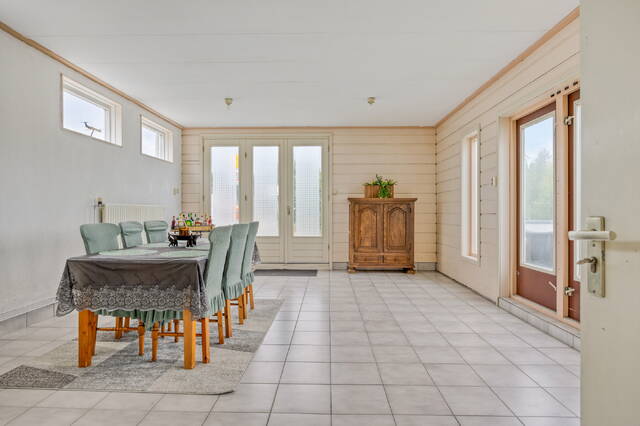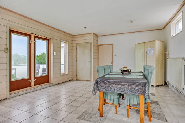 De eetkamer (ca. 33 m2) is voorzien van tegelvloer en een vaste kast met stelplaats voor de HR C.V. combiketel (Remeha 2024). Door de grote deuren en ramen is deze kamer licht en aangenaam. Middels openslaande deuren heeft u toegang tot de dijk. Deze kamer biedt ook toegang tot het zonneterras.