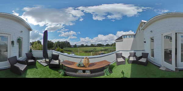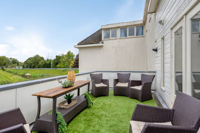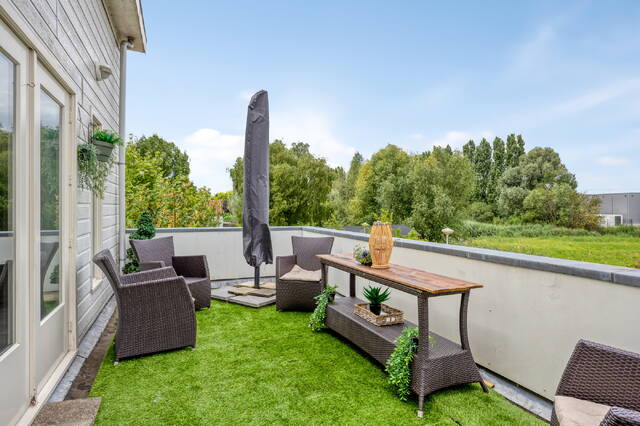 Het zonneterras (ca. 21 m2) is gelegen op het noordoosten en is voorzien van kunststof gras.