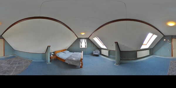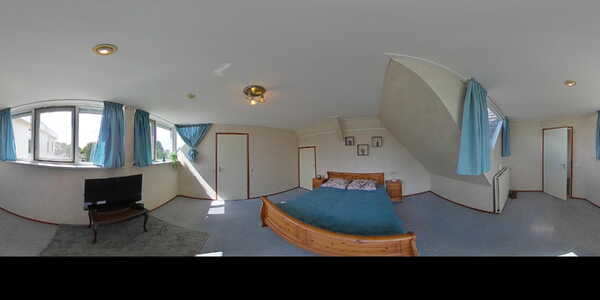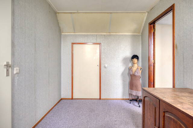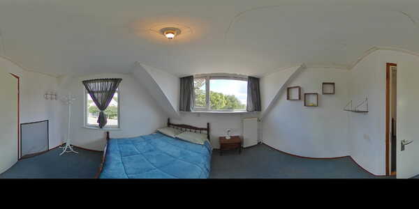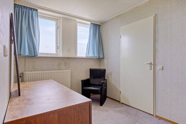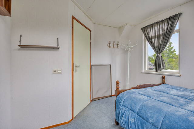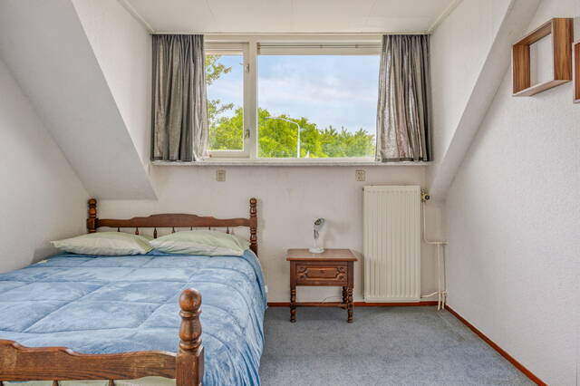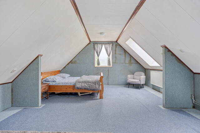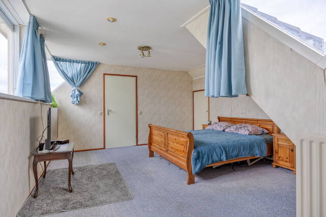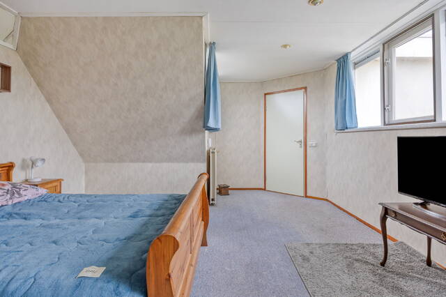 Slaapkamer 1 (ca. 23 m2) is gelegen aan de achterzijde van de woning en is voorzien van 2 dakramen met verduisterend gordijn, en vloerbedekking. Deze kamer heeft een voorkamer met bergruimte achter het knieschot.