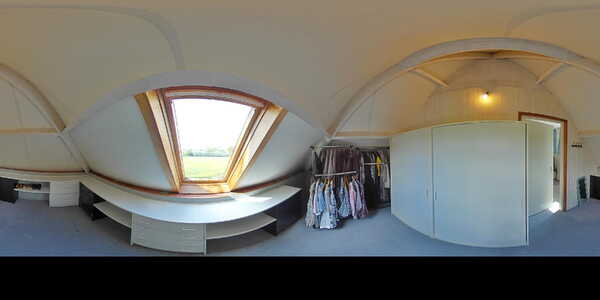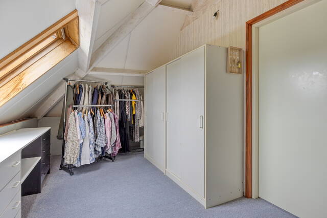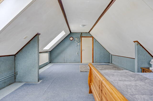 Slaapkamer 2 (ca. 20 m2) is gelegen aan de achterzijde van de woning en is voorzien van vloerbedekking en bergruimte achter het knieschot. Dankzij de dakkapel biedt deze badkamer extra ruimte. Aansluitend bevindt zich een kledingkamer (ca. 9 m2) voorzien van een dakraam.