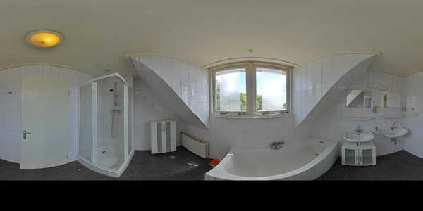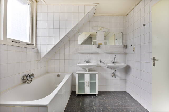 Moderne badkamer (ca. 8 m2) met sanitaire voorzieningen zoals dubbele wastafel, een wastafelmeubel, spiegel en verlichting, ligbad en douchecabine. Dankzij het dakkapel biedt de badkamer extra ruimte. Verder is de badkamer geheel betegeld in wit en met grijze vloertegels.