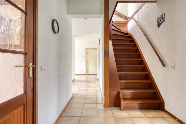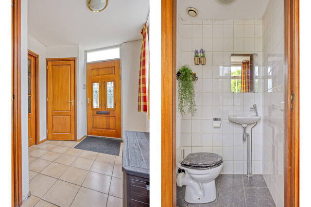 Entree van de woning, ruime hal met meterkast, toiletruimte voorzien van een duoblok en fonteintje. De toiletruimte is geheel betegeld in een wit en grijze tegelvloer. Via een deur heeft u toegang tot de binnenhal. Binnenhal met trap naar de 1e verdieping.