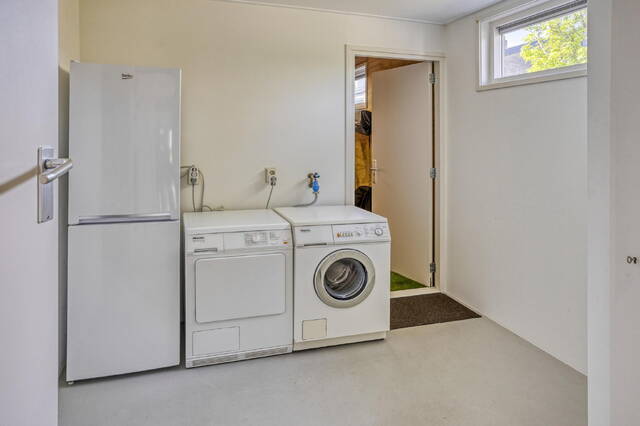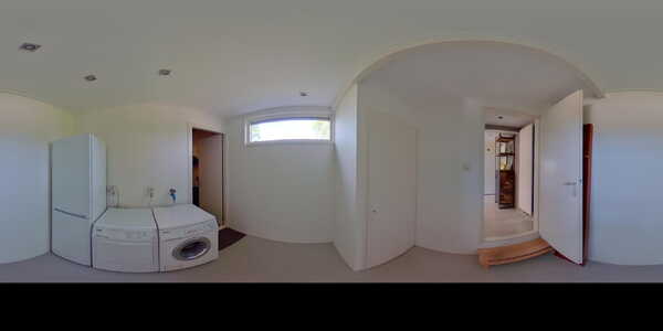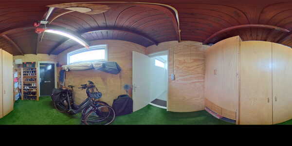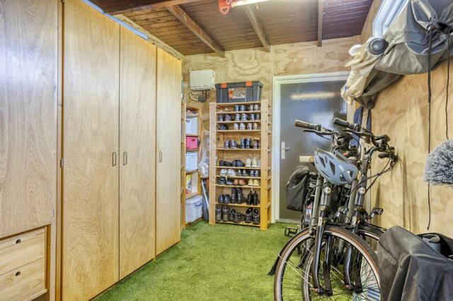 We lopen vanuit de hal naar voren, waar we in de bijkeuken komen. Hier is ruimte voor een extra koel-vriescombinatie, de wasmachine en de droger. Achter de volgende deur lopen we de berging in, waar de fietsen hun plek hebben. Hier is ook volop bergruimte voor andere spullen. In de zijtuin staat een extra berging voor onder andere het tuingereedschap, de parasol etc.