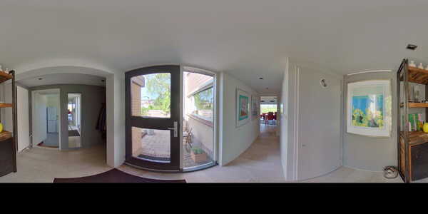 Dan loop je over het pad naar de voordeur en hang je in de hal je jas op.
