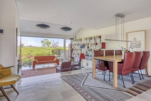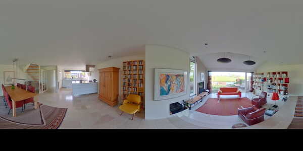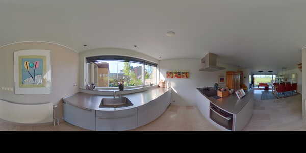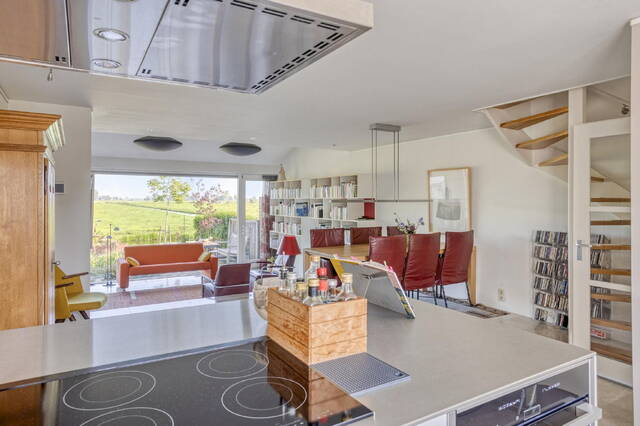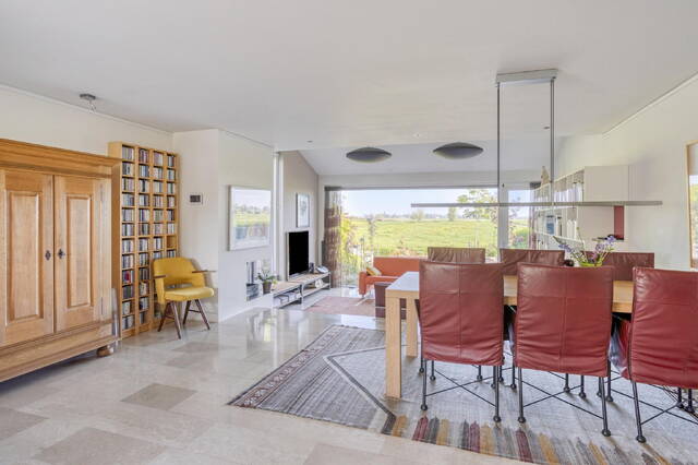 We lopen over de marmeren vloer de woonkamer in. Wat als eerste opvalt is het waanzinnige uitzicht over de polder, zichtbaar vanuit de hele woonkamer en keuken. Het is net een enorm schilderij.