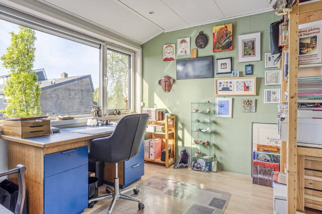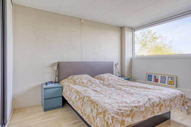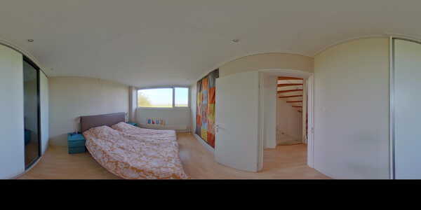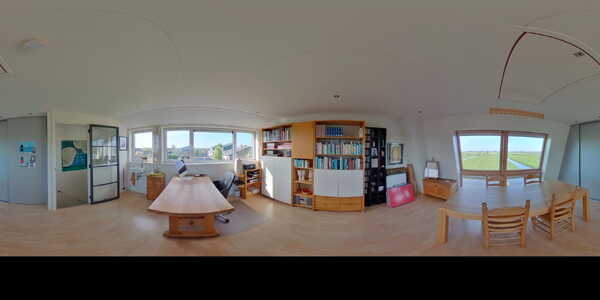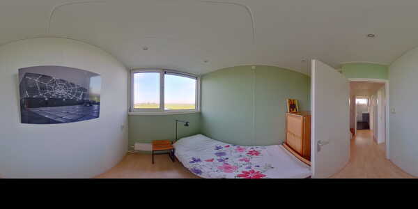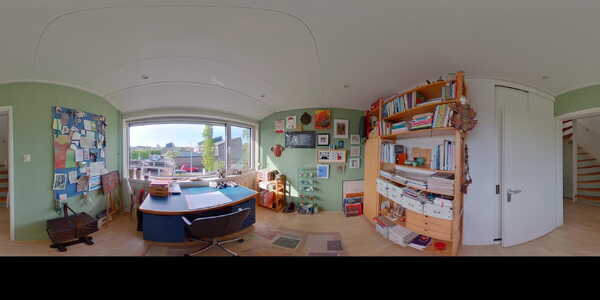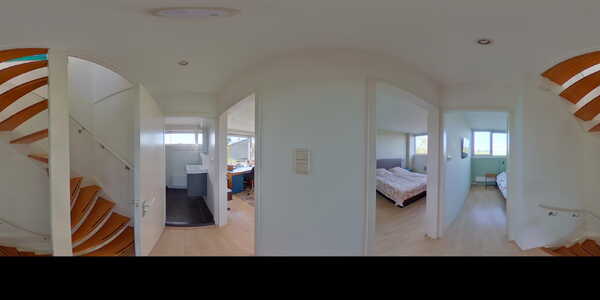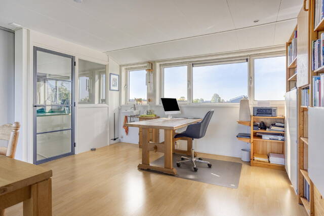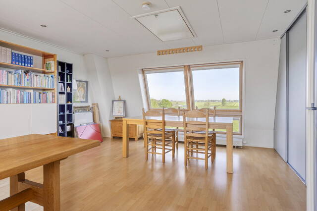 Dan lopen we door naar de tweede verdieping. Wow, deze ruimte van ruim 25 m² is ontzettend licht door de enorme ramen aan beide zijden. Je kijkt hier magnifiek uit over de weilanden – wat een plek! Een hele fijne atelierruimte. Er is een grote inbouwkast met schuifdeuren én een wasbakje met kraan, zodat je voor een glas water niet naar beneden hoeft. Vanuit deze kamer heb je via de vlizotrap nog toegang tot de vliering van ca. 18 m² (onder de 1,5 meter hoogte). De perfecte plek voor je kerstboom en andere spullen die je weinig gebruikt.