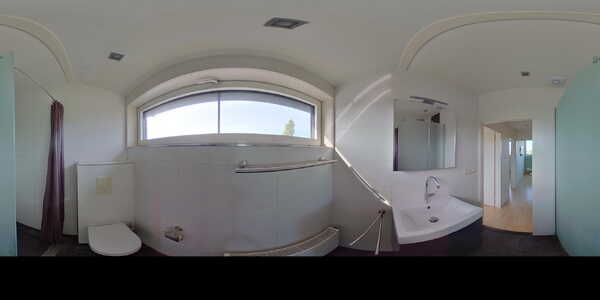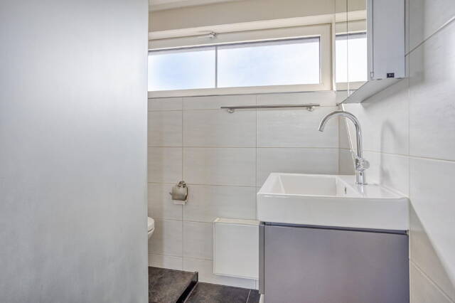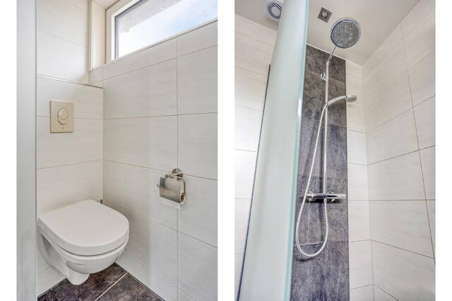 Aan de voorzijde bevindt zich de keurige badkamer. Deze is voorzien van een grote inloopdouche, een tweede toilet en een wastafel met meubel en mengkraan. Boven de wastafel hangt een spiegelkast met verlichting. Dankzij het grote bovenlicht, dat open kan, is de badkamer heerlijk licht.