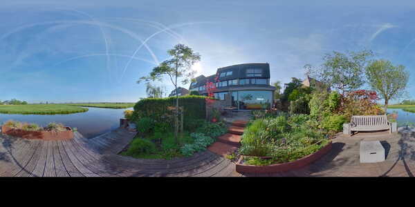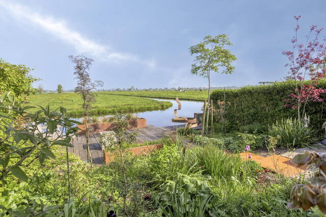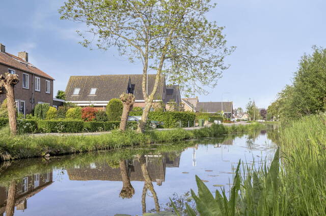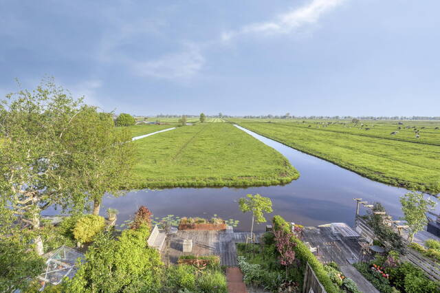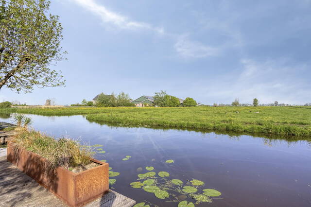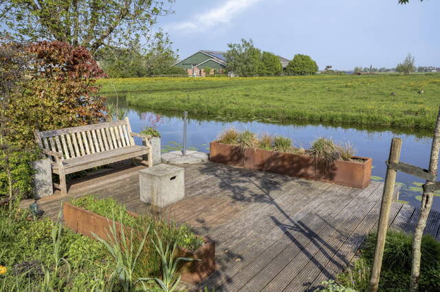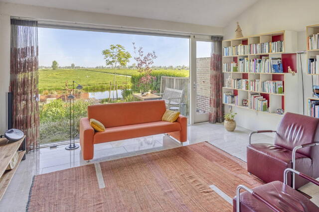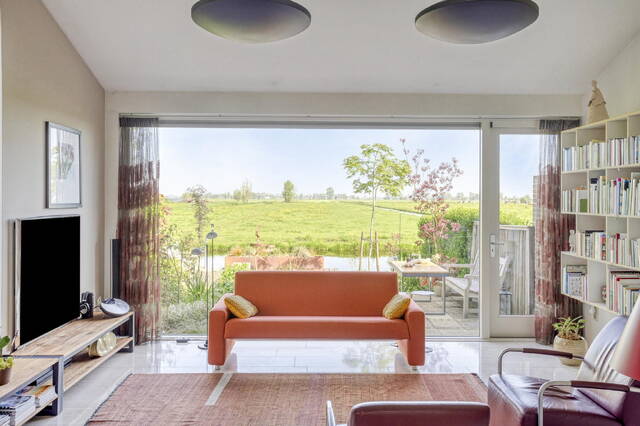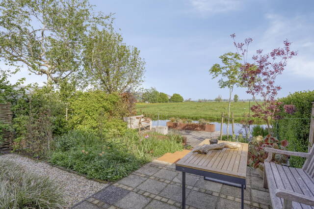 Door het grote zijraam valt veel licht naar binnen. Het zitgedeelte is een aangename ruimte: veel licht, prachtig uitzicht, een speels schuin dak en best knus doordat je lager zit dan de rest van de woonverdieping. Door de tuindeur loop je naar buiten, waar je helemaal vrij zit. Over de sloot heen zie je alleen maar weiland – echt magisch. Het water geeft extra energie. De achtertuin is mooi aangelegd en verdeeld in een eetgedeelte, veel groen, en een deel aan het water waar je heerlijk rustig van de natuur geniet.