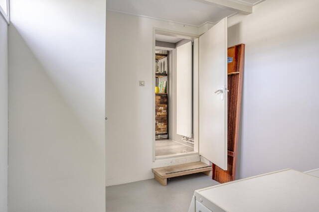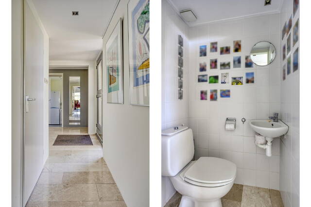 In de ruime hal vinden we het toilet, de meterkast en een aparte bergkast. Aan de voorzijde is toegang tot de bijkeuken en de berging, maar daarover later meer.