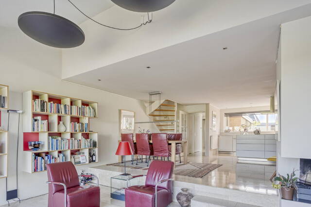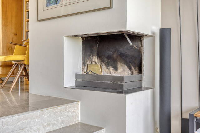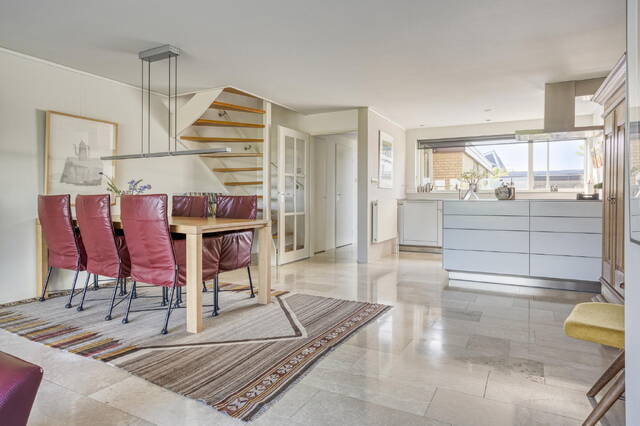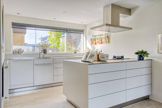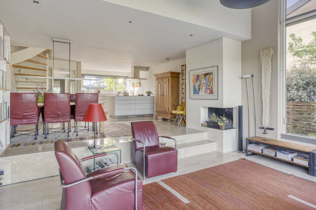De marmeren vloer geeft een luxe uitstraling, is makkelijk schoon te houden en is de perfecte geleider voor de vloerverwarming, die ligt in de keuken en het eerste gedeelte van de woonkamer. De woonkamer bestaat uit twee delen: het eerste deel met de eettafel en een fijn leeshoekje, en het zitgedeelte, waar je twee treden lager komt. Dat hoogteverschil geeft een speels en ruimtelijk effect.