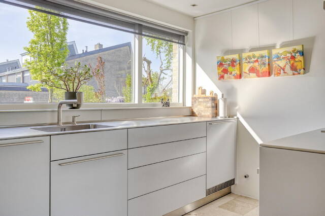 Aan de woonkamerzijde zijn ruime lades, aan de keukenzijde idem dito. Verder vind je hier een vaatwasser, koelkast, combi-oven en een grote spoelbak met mengkraan en zeepdispenser. Door het kamerbrede raam aan de voorzijde komt lekker veel licht naar binnen en kijk je trots uit over je eigen voortuin. Bij het keukenraam is een screen geplaatst om de zon buiten te houden op warme zomerdagen.