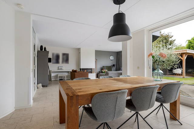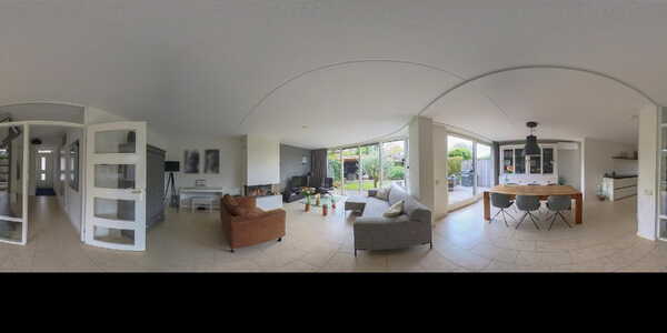 De glazen paneeldeur geeft toegang tot de sfeervolle woonkamer. De lichte plavuizen vloer met vloerverwarming zorgt voor comfort, terwijl de grote raampartijen en de ronde glazen pui aan de tuinzijde een prachtig uitzicht bieden over de achtertuin. De moderne schouw met gashaard en airconditioning (koeling/verwarming) maken het geheel compleet.