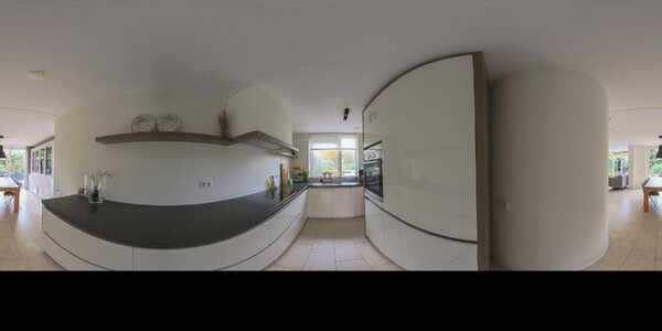 Het eetgedeelte grenst aan de schuifpui naar de tuin (voorzien van elektrisch rolluik), ideaal voor lange zomeravonden. De halfopen keuken aan de voorzijde is luxe uitgevoerd in wit hoogglans met een donkergrijs composiet werkblad. De keuken is voorzien van hoogwaardige inbouwapparatuur, waaronder een combi-oven, koel-vriescombinatie, vaatwasser, 5-pits inductiekookplaat met geïntegreerde afzuigkap, Quooker-kraan, apothekerskast en praktische LeMans-carrouselkast.