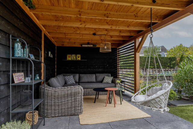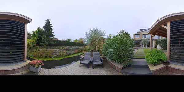De achtertuin ligt op het westen en is een ware oase van rust. Fraai aangelegd met kunstgras, volwassen groen – waaronder een olijfboom, palm en perenboom – en een recent vernieuwde beschoeiing en vlonderterras aan de waterkant. Achter in de tuin bevindt zich een sfeervolle veranda van Douglas hout, perfect voor een loungehoek met uitzicht over de gezellige tuin.