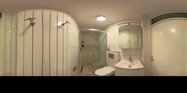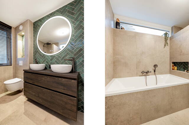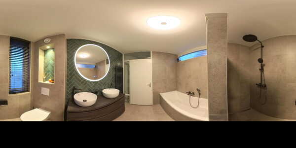 De tweede badkamer is volledig betegeld in wit/beige tinten en voorzien van een inloopdouche, wastafelmeubel met spiegelkast en hangend toilet – perfect voor gezinnen of gasten.