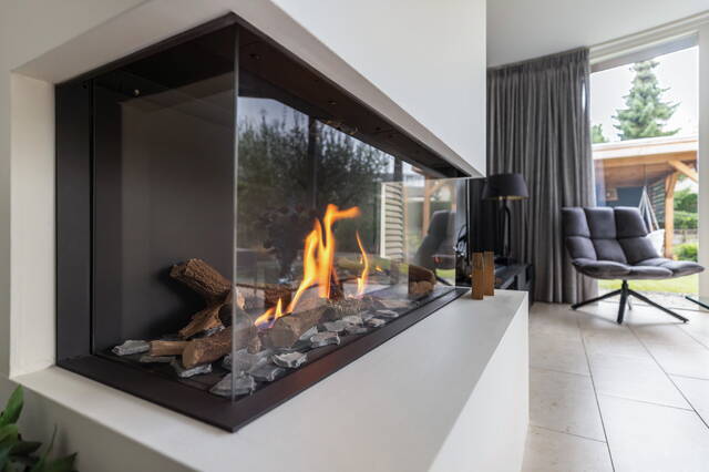 Lichte woonkamer met vloerverwarming, gashaard en airconditioning (koelen en verwarmen)