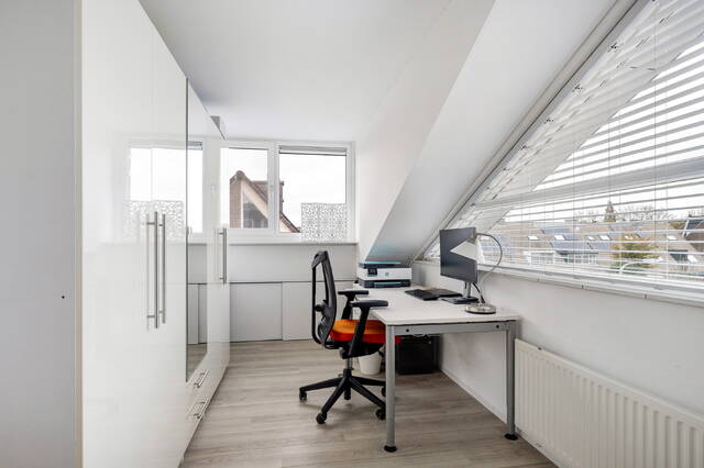 Slaapkamer 4 ligt aan de voorzijde, is nu ingericht als werkkamer maar biedt voldoende ruimte om als slaapkamer te fungeren. Slaapkamer 5 ligt aan de achterzijde.