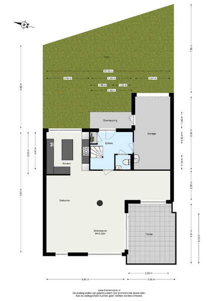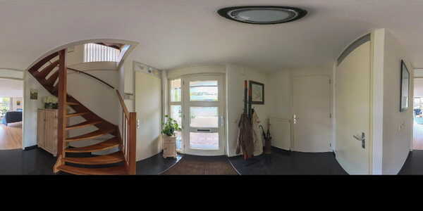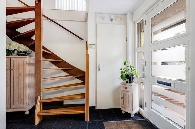 De royale voortuin biedt parkeergelegenheid op eigen terrein. Via de entree komt u in de ruime hal met trapopgang, modern toilet en toegang tot de inpandige, geïsoleerde garage – ideaal voor het stallen van fietsen, opslag of als hobbyruimte.