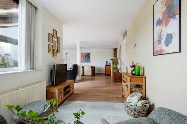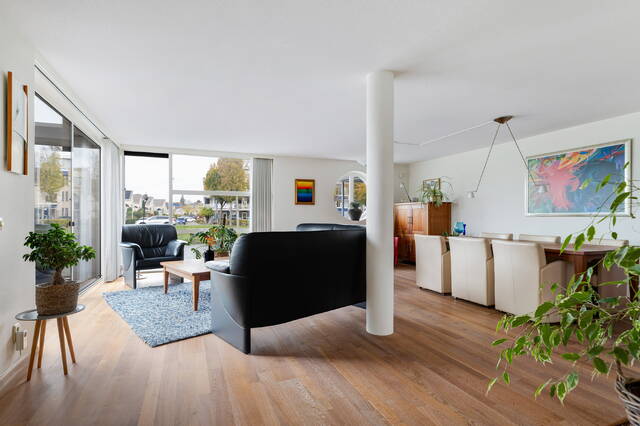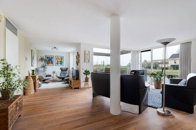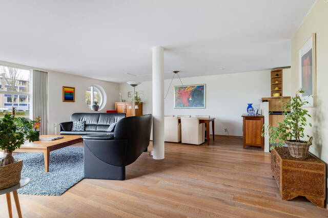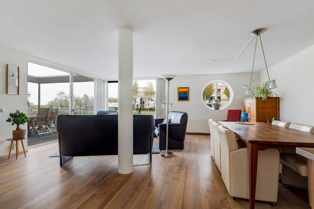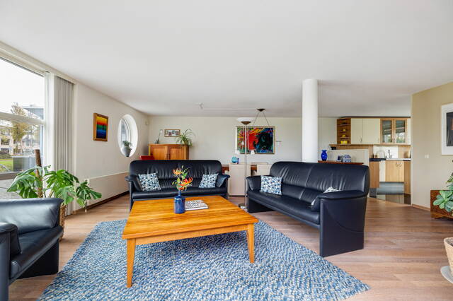 De living is royaal en sfeervol, met grote raampartijen en een schuifpui naar het terras aan het water. Dankzij de eikenhouten whitewash vloer en de speelse indeling ontstaat er een lichte en uitnodigende leefruimte met volop mogelijkheden voor meerdere zithoeken.