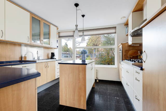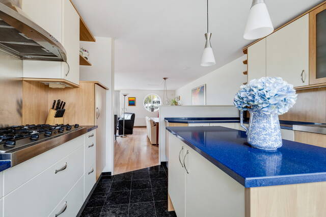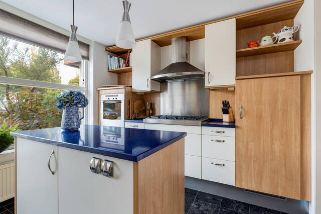 Aan de voorzijde bevindt zich de moderne woonkeuken, uitgerust met een royaal werkeiland met bergruimte en de vriezer. De keuken is voorzien van diverse inbouwapparatuur zoals een koelkast, 6-pits gaskookplaat met RVS-afzuigkap, combi-oven, vaatwasser en een stijlvol composiet werkblad. De donkere Belgisch hardstenen vloer vormt een prachtig contrast met de lichte woonkamer.