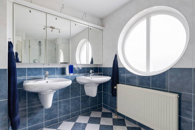 De badkamer is modern en praktisch ingedeeld met een douchecabine, dubbele wastafel en royale bergruimte in de diverse spiegelkasten. De gehele verdieping is afgewerkt met een laminaatvloer, wat zorgt voor een verzorgde uitstraling.