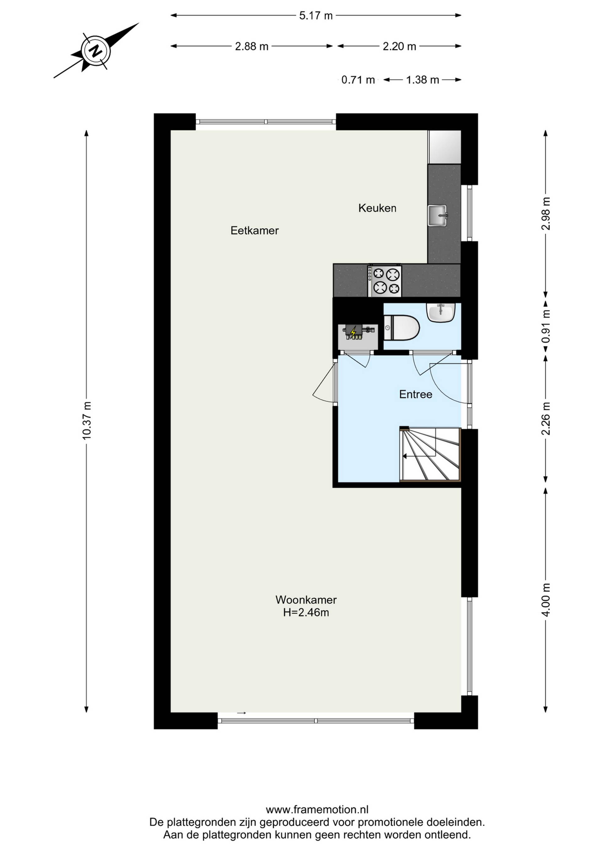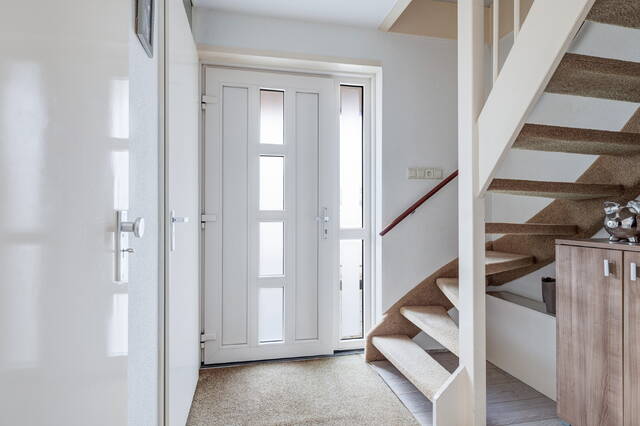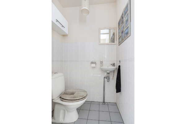 Entree aan de zijkant van de woning met hal, meterkast en trapopgang naar de eerste verdieping. De toiletruimte is uitgevoerd met een duoblok toilet en fonteintje en gedeeltelijk betegeld in een lichte kleur.