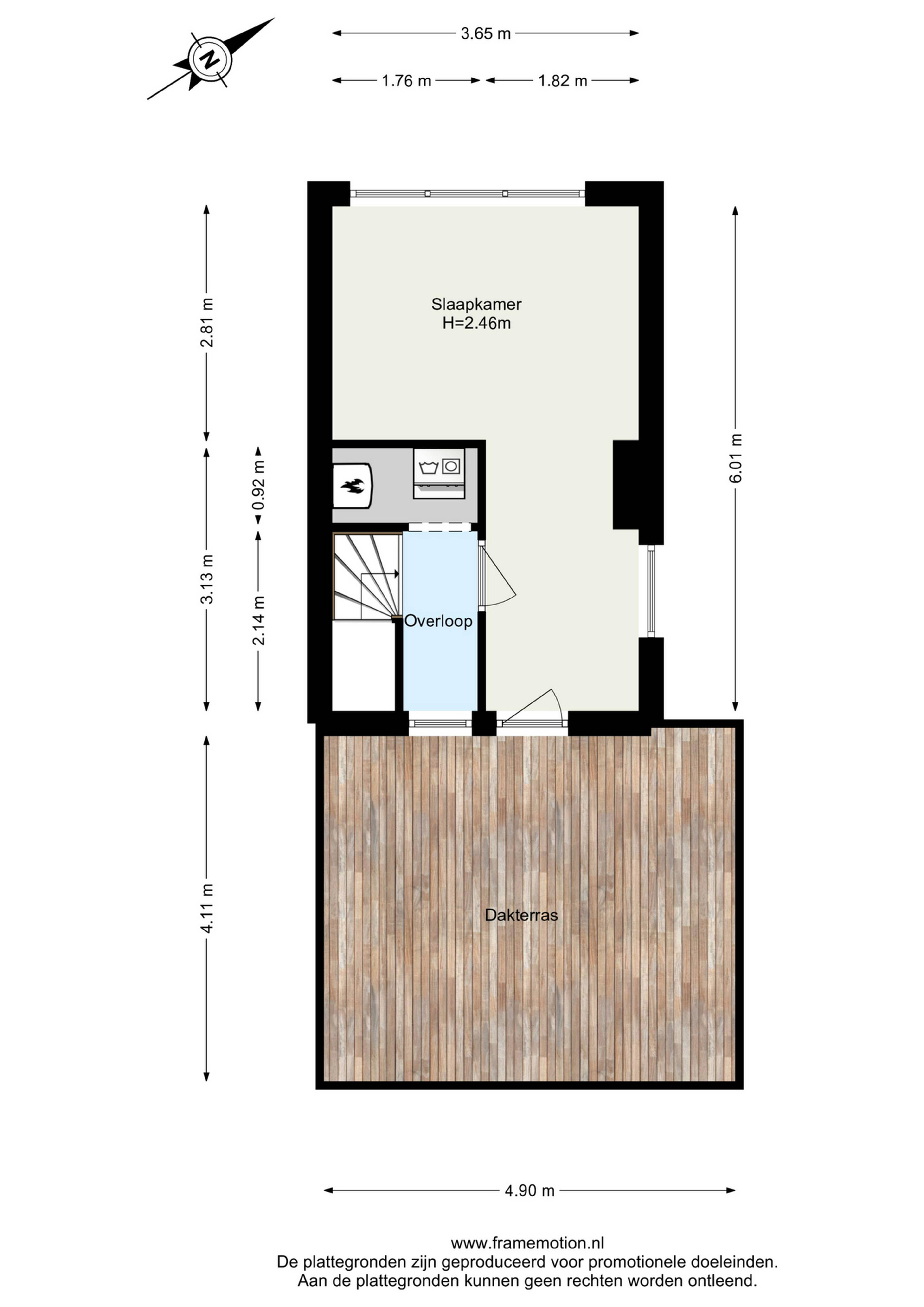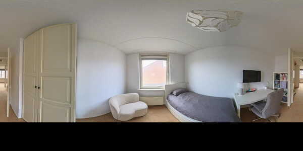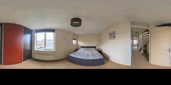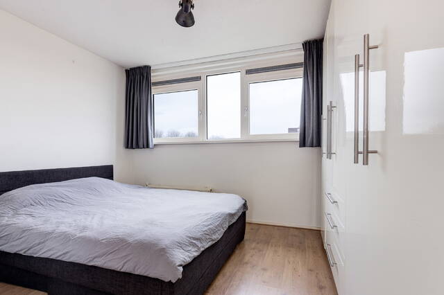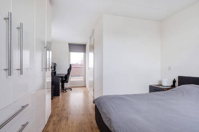 Slaapkamer 4 – royale slaapkamer met vaste kastenwand, laminaatvloer en directe toegang tot het dakterras.