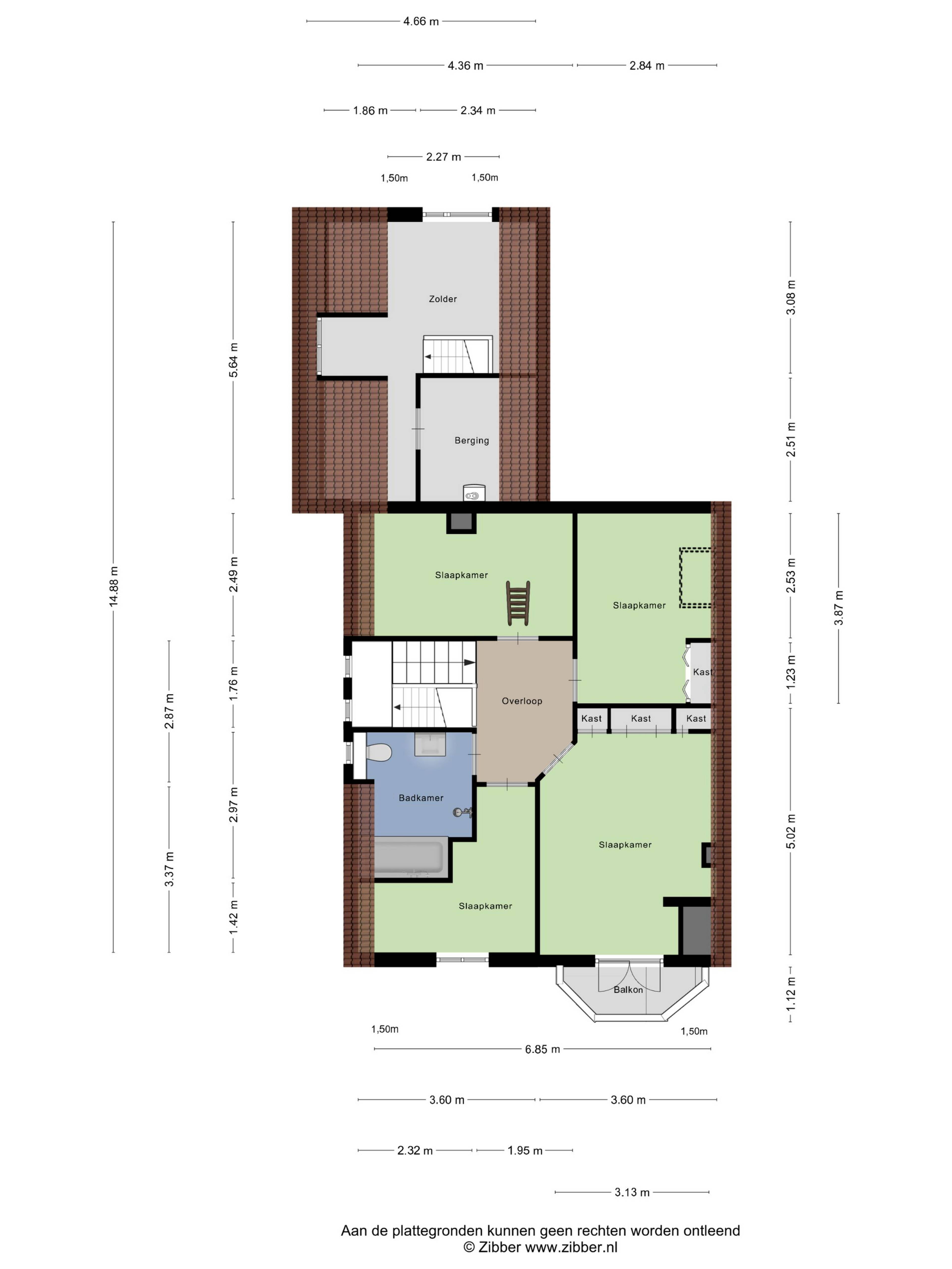 Slaapkamer 7 (ca. 11 m2) is gelegen aan de achterzijde van de woning en is voorzien van vloerbedekking en glas-in-lood raam. Via deze kamer is de bergvliering te bereiken.