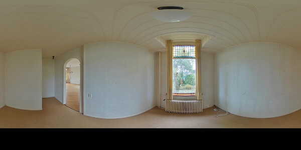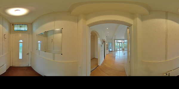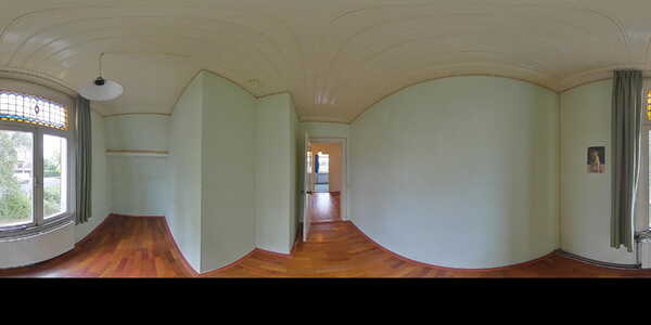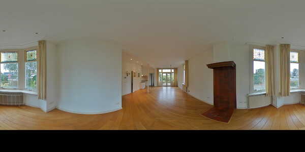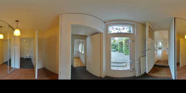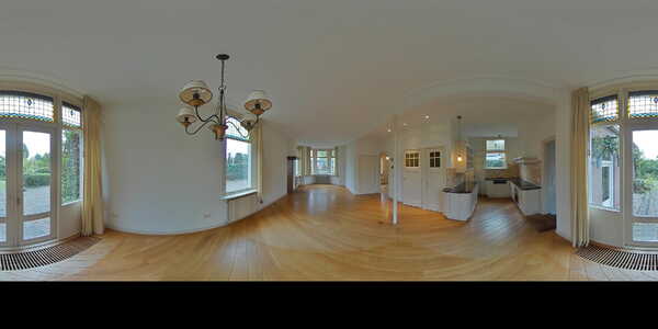 Sfeervolle lichte doorzon woonkamer (ca. 42 m2) voorzien van een lichte houten vloer, hoog plafond met sierlijsten en schitterende glas-in-loodramen. De meterkast is afgewerkt in een vaste kast. Middels openslaande deuren heeft u toegang tot de zonnige achtertuin. Via de woonkamer heeft u toegang tot de werkkamer.