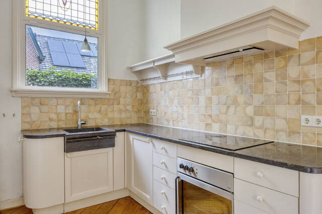 De open keuken (ca. 6 m2) is uitgevoerd in een L-opstelling met een extra recht deel met kastruimte. De keuken is afgewerkte met een fraaie hardsteen aanrechtblad en spoelbak. De keuken is verder voorzien van een keramische kookplaat, een schouw met ingebouwd afzuigsysteem, oven en een vaatwasser. De achterwanden zijn afgewerkt met tegelwerk en de vloer met houtvloerdelen. Via de keuken bereikt u de voorraadkast/bijkeuken.