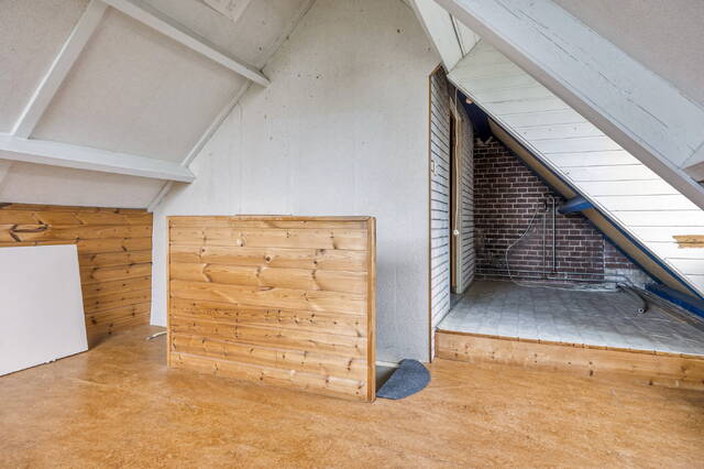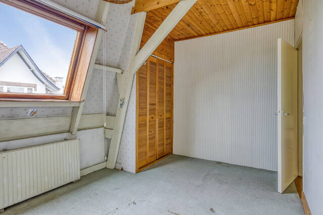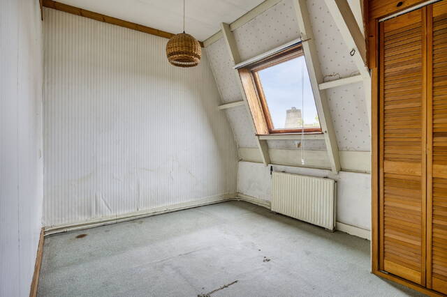 Slaapkamer 3 (ca. 8 m2) is gelegen aan de achterzijde van de woning en voorzien van linoleum vloer. Dankzij de dakkapel en het raam biedt deze kamer veel natuurlijke lichtinval.