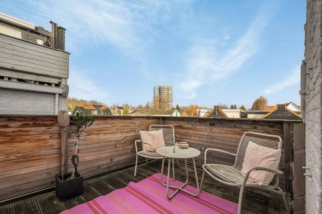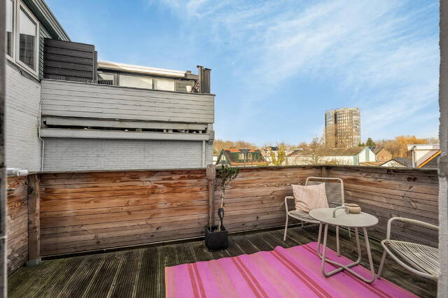 Een compact, fraai afgewerkt terras met houten vloer, gesitueerd op het noordwesten. Een heerlijke plek om aan het einde van de dag nog even in de zon te zitten en te genieten van het zicht over de wijk.