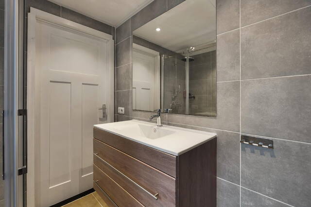 De badkamer (2019) heeft een moderne afwerking met inloopdouche, wastafelmeubel, tweede hangend toilet, designradiator en uitzetraam. Licht, fris en comfortabel.