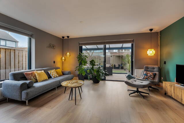 Lichte tuingerichte living (ca. 35 m2) voorzien van laminaatvloer met elektrische vloerverwarming en gestucte wanden en plafond. De woonkamer beschikt verder over een handige trapkast. Ideaal om te gebruiken als voorraadkast en/of extra bergruimte. De hoekligging, gecombineerd met de schuifpui aan de achterzijde, zorgt voor een uitzonderlijke lichtinval op de begane grond. Het natuurlijke licht stroomt overvloedig binnen en versterkt het ruimtelijke gevoel. Middels een schuifpui heeft u toegang tot de aangebouwde overkapping.