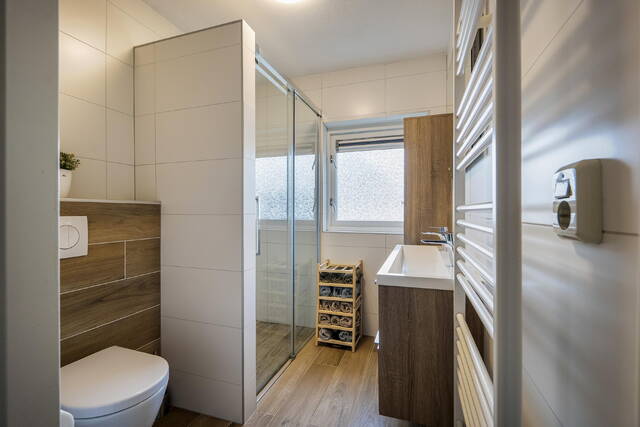 Moderne badkamer (ca. 4 m2) met sanitaire voorzieningen zoals dubbele wastafel met wastafelmeubel, spiegel, verlichting, hangcloset, inloopdouche en een designradiator. De badkamer is geheel betegeld en afgewerkt met houtlook tegelvloer.