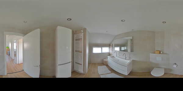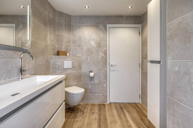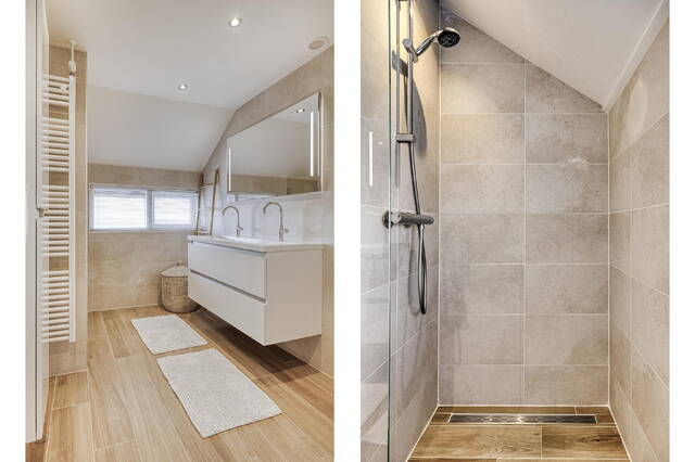 Op de eerste verdieping treffen we drie slaapkamers, allen voorzien van laminaatvloeren en glad gestucte wanden en plafonds. De hoofdslaapkamer aan de achterzijde is voorzien van airconditioning. In een van de kamers is een opstelling voor de wasmachine en droger gemaakt. De badkamer is vergroot door het voormalige balkon erbij te betrekken en is luxe afgewerkt met een grote inloopdouche, een mooi dubbel wastafelmeubel met twee mengkranen en twee grote laden, een verlichte spiegel en het tweede toilet. Ook hier is de verlichting mooi in het plafond verwerkt. Je hangt de handdoeken te drogen aan de designradiator.
