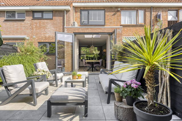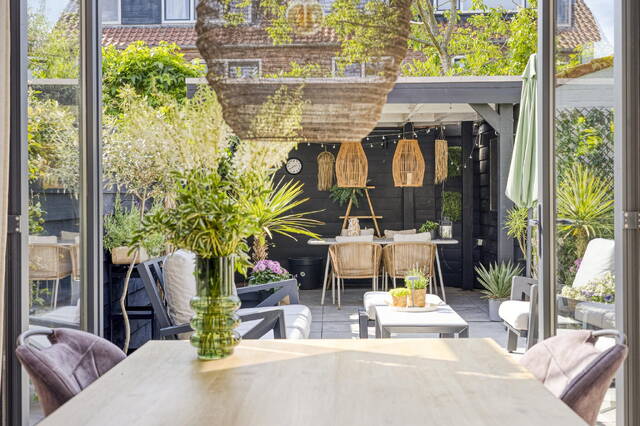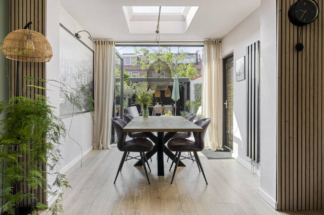Via de ruime en keurig aangelegde voortuin lopen we naar de houten voordeur die in 2022 nieuw geplaatst is. Daar kom je binnen in de hal met meterkast, toegang tot het toilet en de trap naar boven. Dan lopen we door de moderne glazen deur via de open keuken de woonkamer in. Wat een ruimte: dankzij de uitbouw aan de achterzijde is de woonkamer echt royaal en heeft de zithoek aan de voorzijde heerlijk de ruimte. Daarnaast is er ruimte voor een dressoir om de dagelijkse dingetjes in op te bergen. Aan de achterzijde is de uitbouw voorzien van een fijne lichtkoepel die zorgt voor extra daglicht en een zeer ruimtelijk gevoel geeft. De ultieme plek voor de eettafel, waar je al snel lekker met de openslaande deuren zit te eten. De woonkamer loopt door de grote openslaande deuren bijna naadloos over in de tuin, erg mooi gedaan. De grote aluminium deuren zijn geplaatst in 2019.