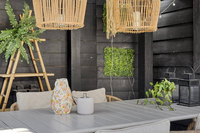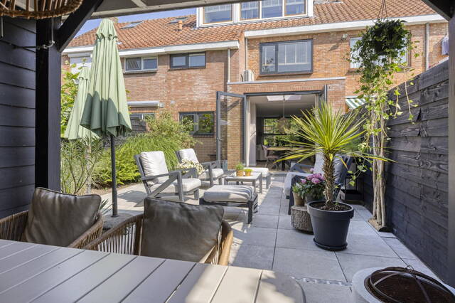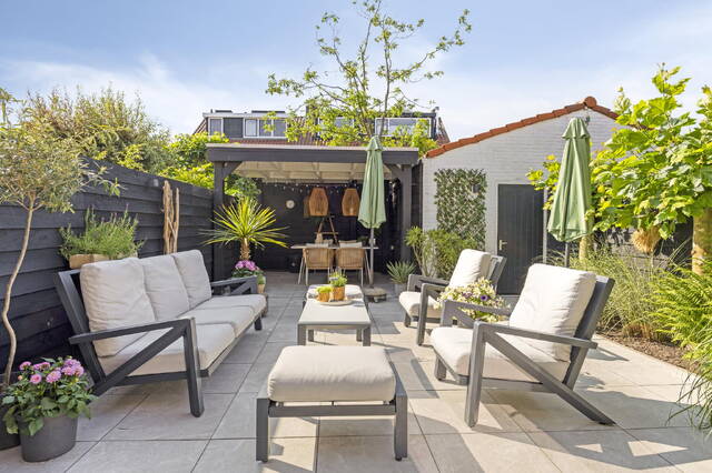 De tuin van ruim 64 m2 ligt op het zonnige zuiden en is erg mooi aangelegd. Er liggen grote tegels en er is een brede border met beplanting en twee boompjes die in de zomer vol in bloei staan en je wat extra privacy geven. Er is ruimte voor een grote loungehoek en aan de stenen berging is een mooie houten overkapping gebouwd waar je het hele jaar door kunt genieten van het buitenleven. Er is een achterom om de fietsen in de berging te stallen.